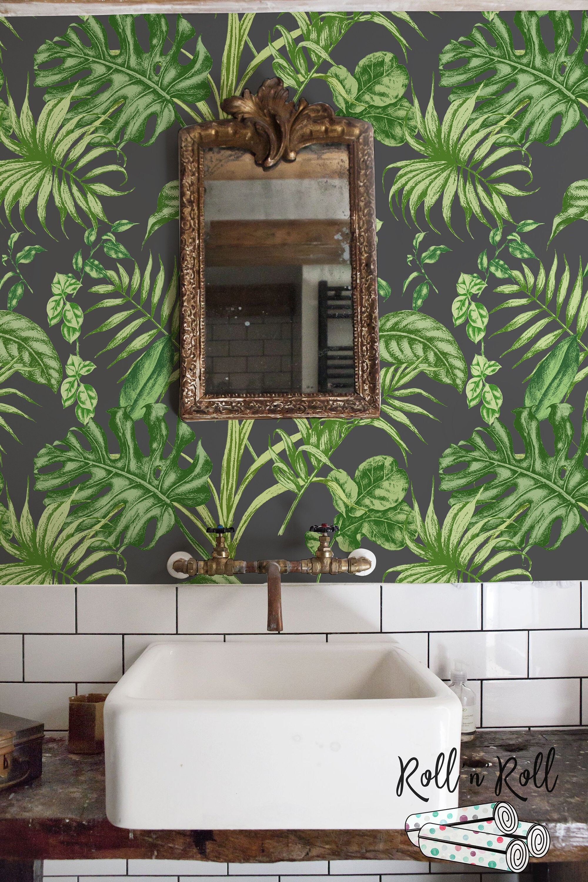 These prints are busy and busy prints tend to work better in smaller spaces so your bathroom and powder room areas are. Tropical Wallpaper Banana Leaf Wallpaper Wall Decor Peel and Stick Removable Wallpaper Watercolor Banana Leaf Mural Wallpaper - A794. A tropical bathroom in neutrals with a banana leaf curtain green towels a green ceiling and bold artworks.
