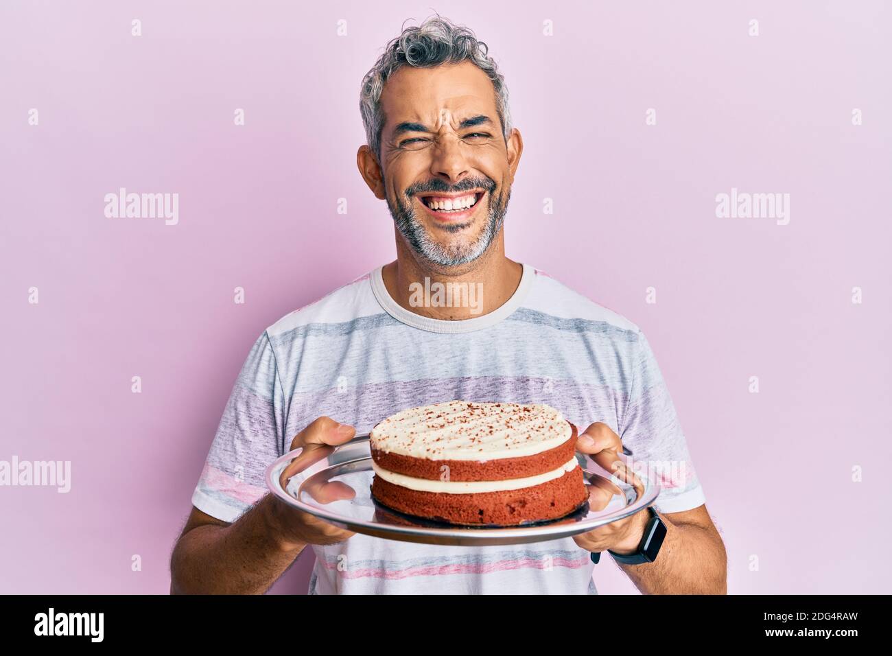 Middle Age Grey Haired Man Holding Carrot Cake Smiling And Laughing Hard Out Loud Because Funny Crazy Joke Stock Photo Alamy
